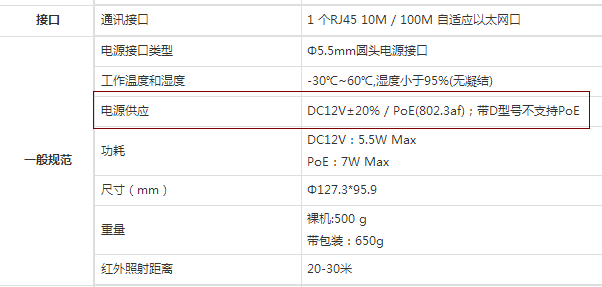 二、海康威視的設(shè)備POE供電參數(shù):
